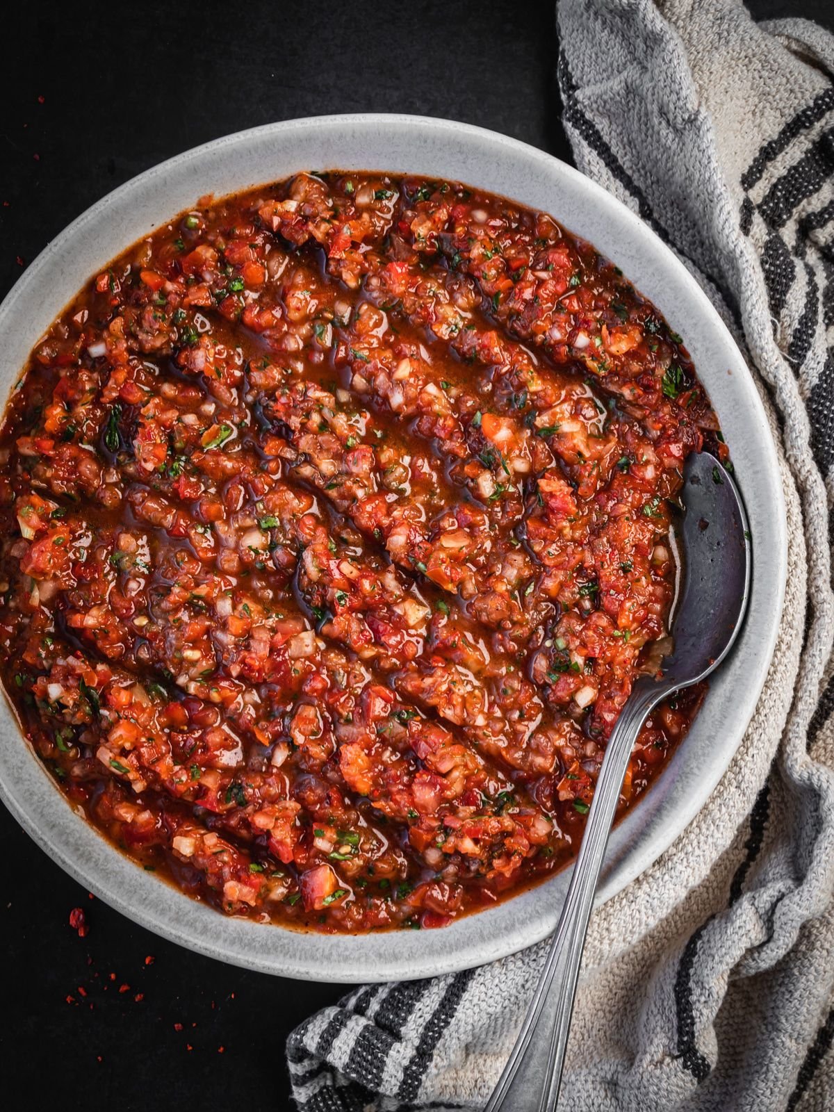 Acılı EzmeFinely chopped spicy tomato, pepper, walnut, and herb dip.