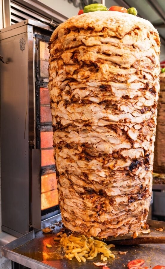 Tavuk DönerThinly sliced marinated chicken from vertical rotisserie; served with rice and salad.