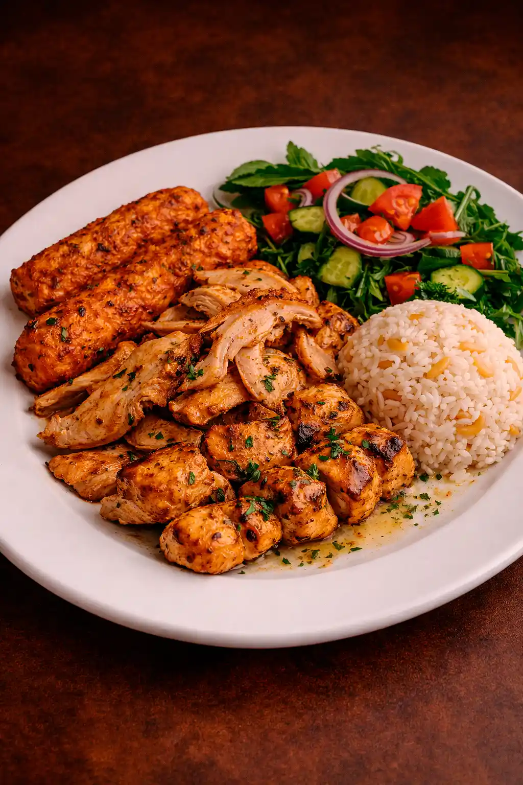 Karışık Tavuk IzgaraCombination of chicken adana, chicken gyro, and chicken shish; served with rice and salad.