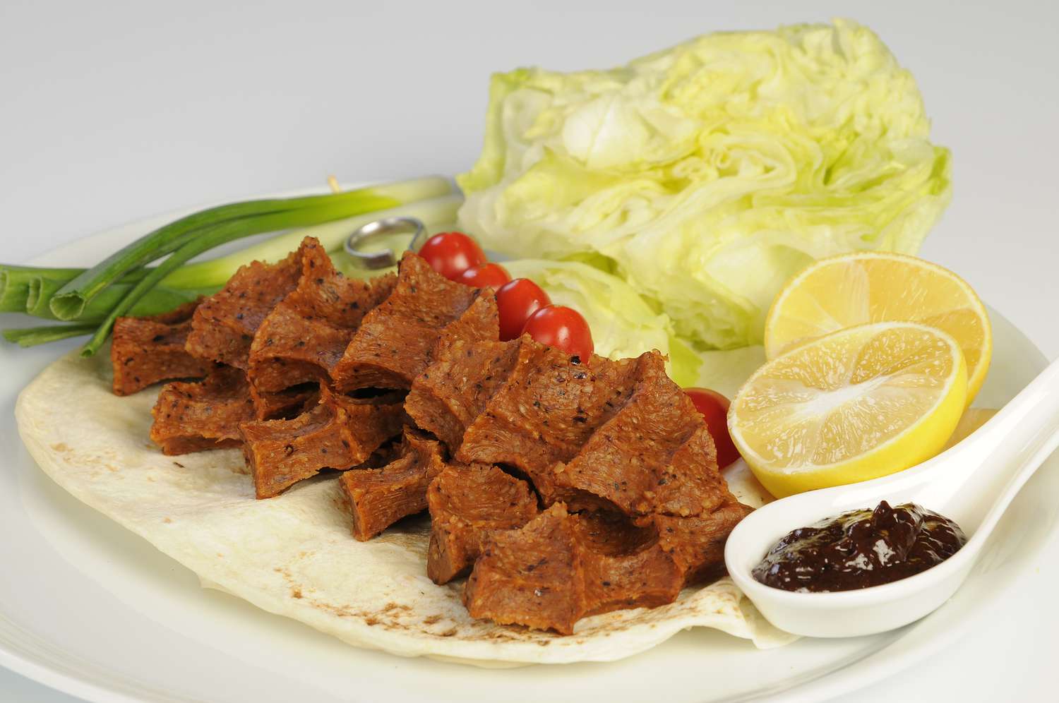 Dana ŞişGrilled marinated beef cubes served with rice and salad.