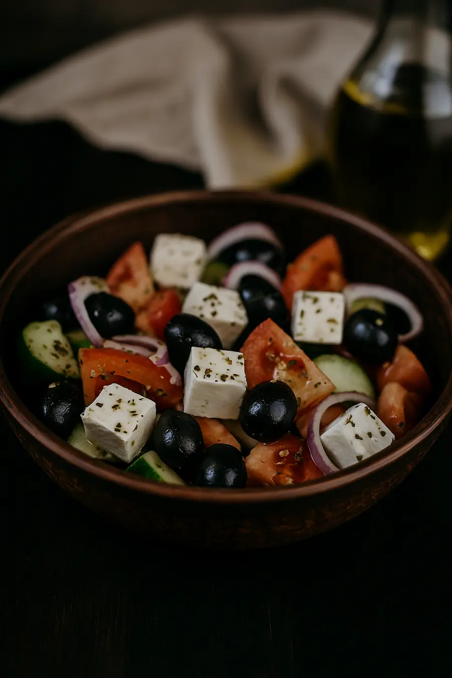 Akdeniz SalatasıGreens, tomatoes, cucumbers, onions, olives, and feta cheese.