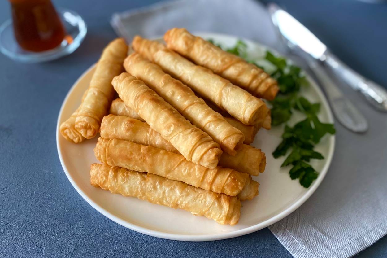 Crispy phyllo rolls filled with feta cheese and parsley.