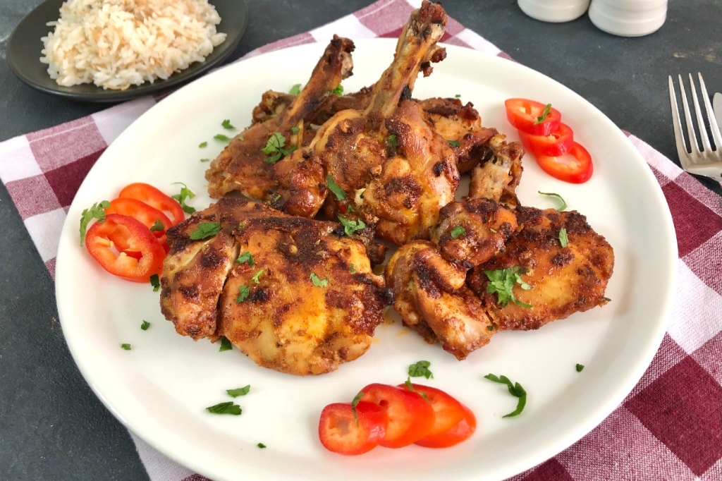 Tavuk PirzolaGrilled chicken thighs served with rice and salad.
