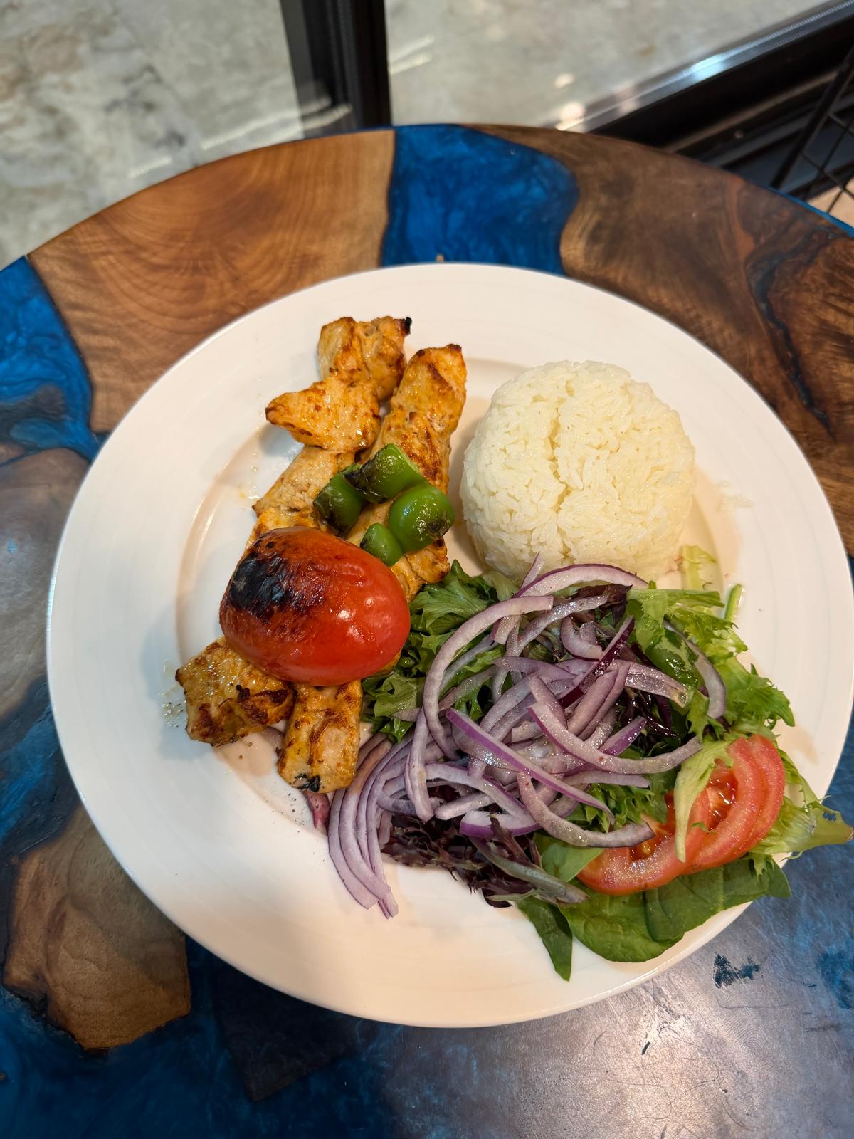 Tavuk ŞişMarinated chicken cubes grilled and served with rice and salad.